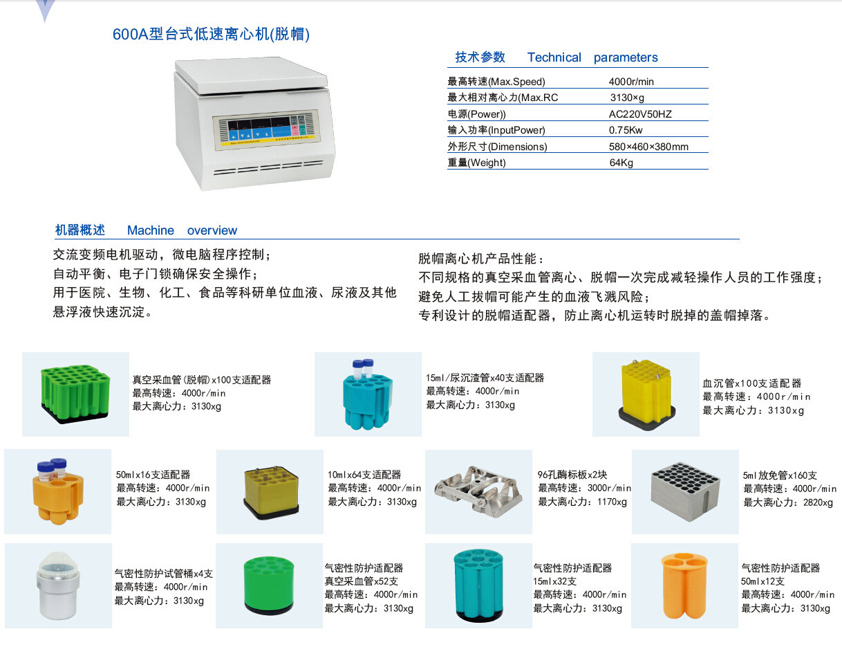 600A型台式低速离心机(自动脱帽)