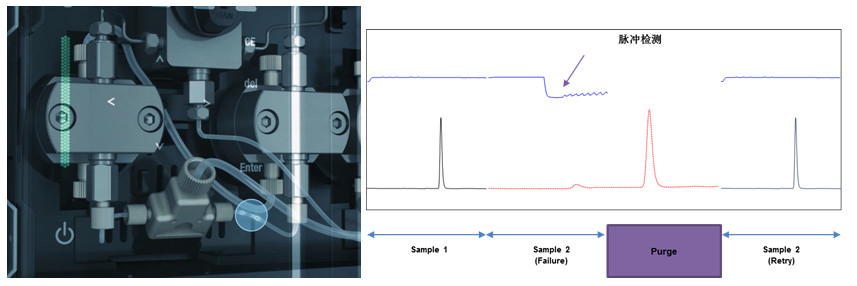 色谱泵的自我诊断/自我恢复功能:自动检测到批处理分析过程中意外混入的气泡,自动执行Purge,快速恢复至正常分析状态,如图所示: