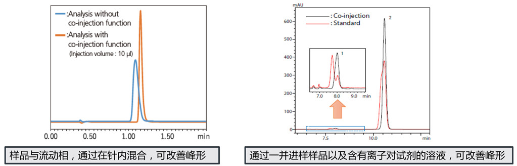 Co-injection功能:改善峰型,提高定量灵敏度。尤其当样品溶液含高比例有机溶剂时,可以直接进样分析而无需担心溶剂效应。如SPE或QuEChES等样品前处理过程中,当使用纯有机溶剂解吸后所获得的溶液,无需吹干复溶等复杂操作。
