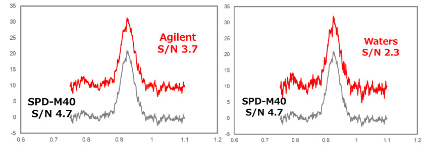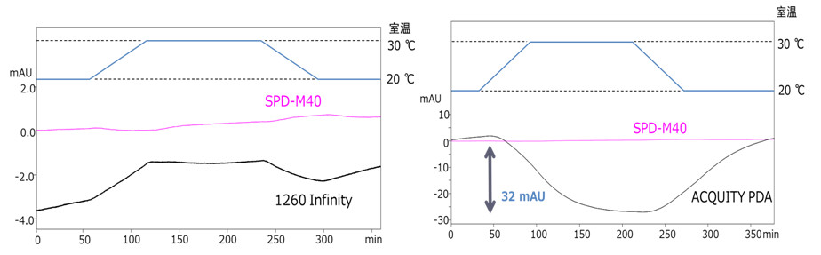 使室温波动10ºC时,考察SPD-M40二极管阵列检测器的基线稳定性及灵敏度水平,并与其他品牌作了比较(分析条件:流动相:MeOH;流量:1.0mL/min;波长:260nm)检测结果如图所示,SPD-M40检测器基线稳定性极佳、灵敏度也有明显优势: