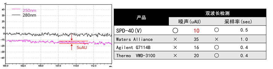 灵敏度与双波长检测模式考察:通过考察,可以发现即使是在双波长检测的模式下,SPD-40V也能做到采样周期短,同时实现整个行业最小的噪声值,如图所示: