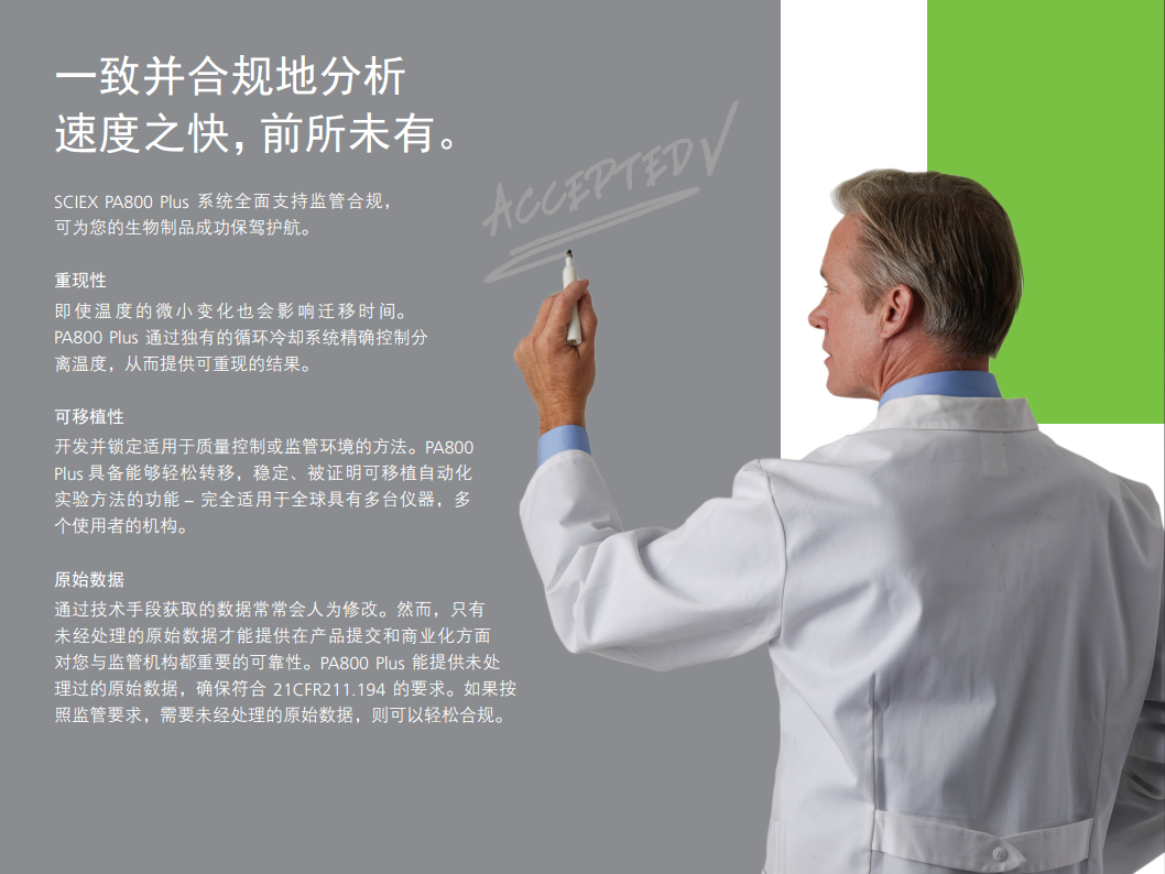 PA800 Plus生物制药分析系统具有强大的分析功能及易于使用的特性,可对蛋白纯度、电荷异构体的分布和糖类进行自动化定量及定性分析。目前,已有上百家全球生物制药企业使用PA800 Plus,该系统为他们提供了对蛋白特性分析的自动化定量综合解决方案。 PA800 Plus创新型的设计体系确保其操作的可靠性和持久性,是用户值得信赖的产品。