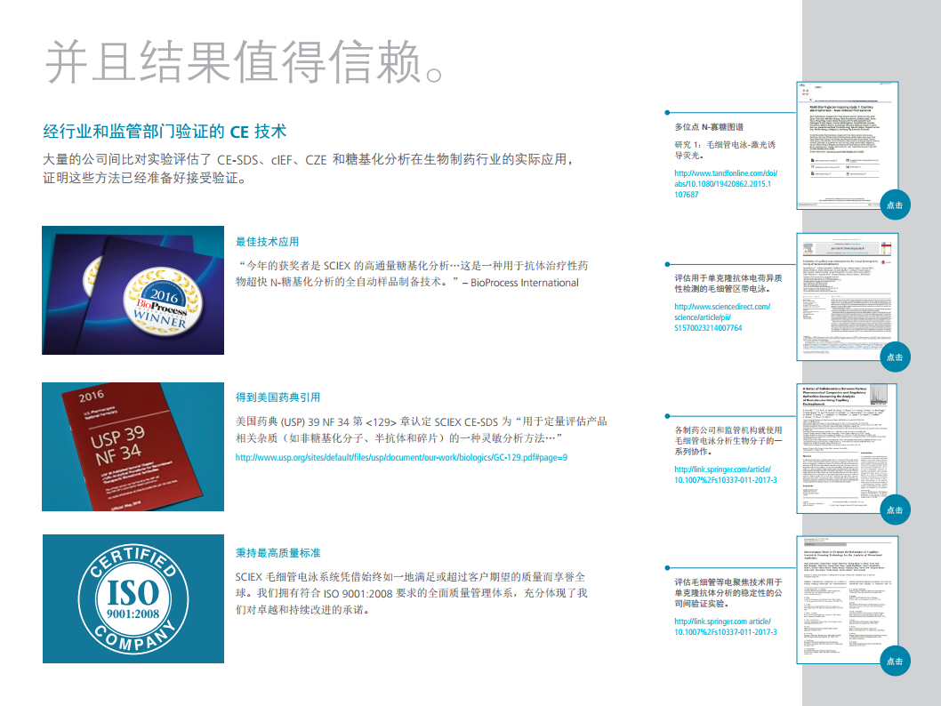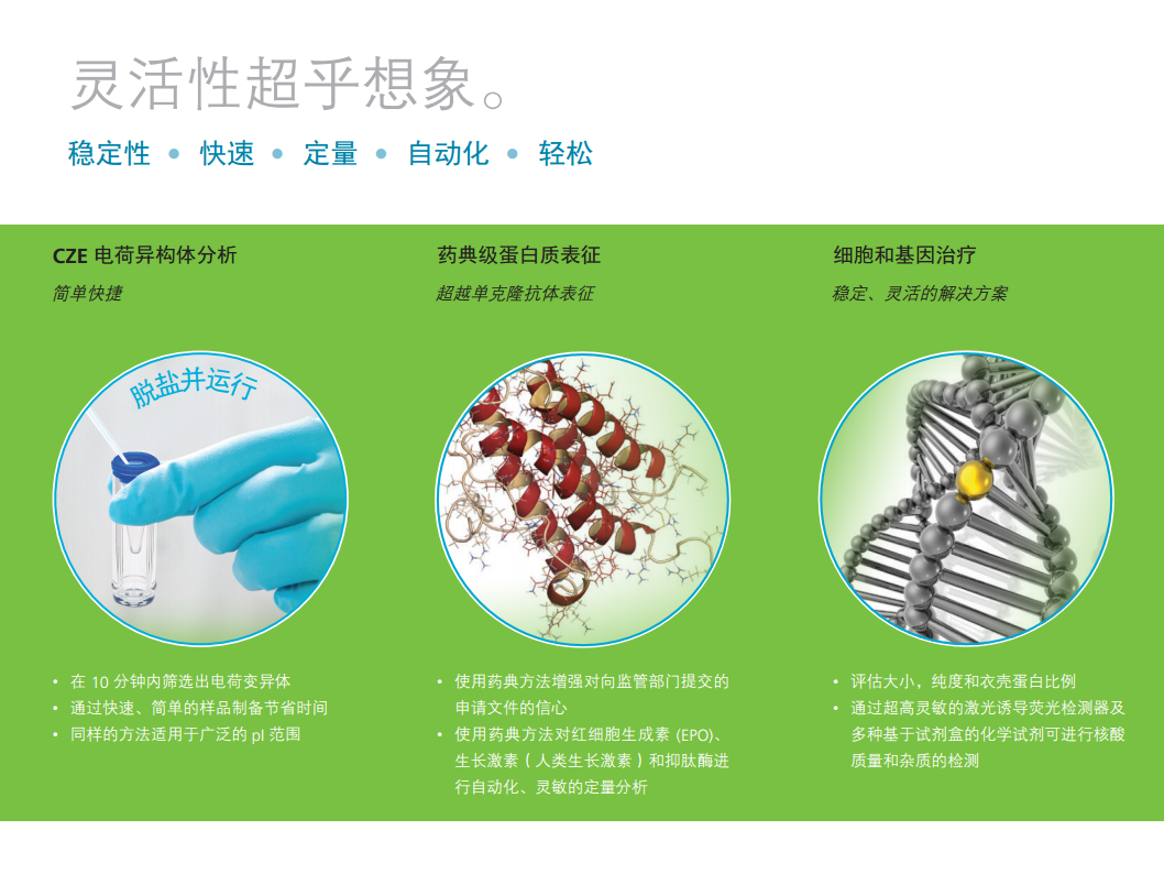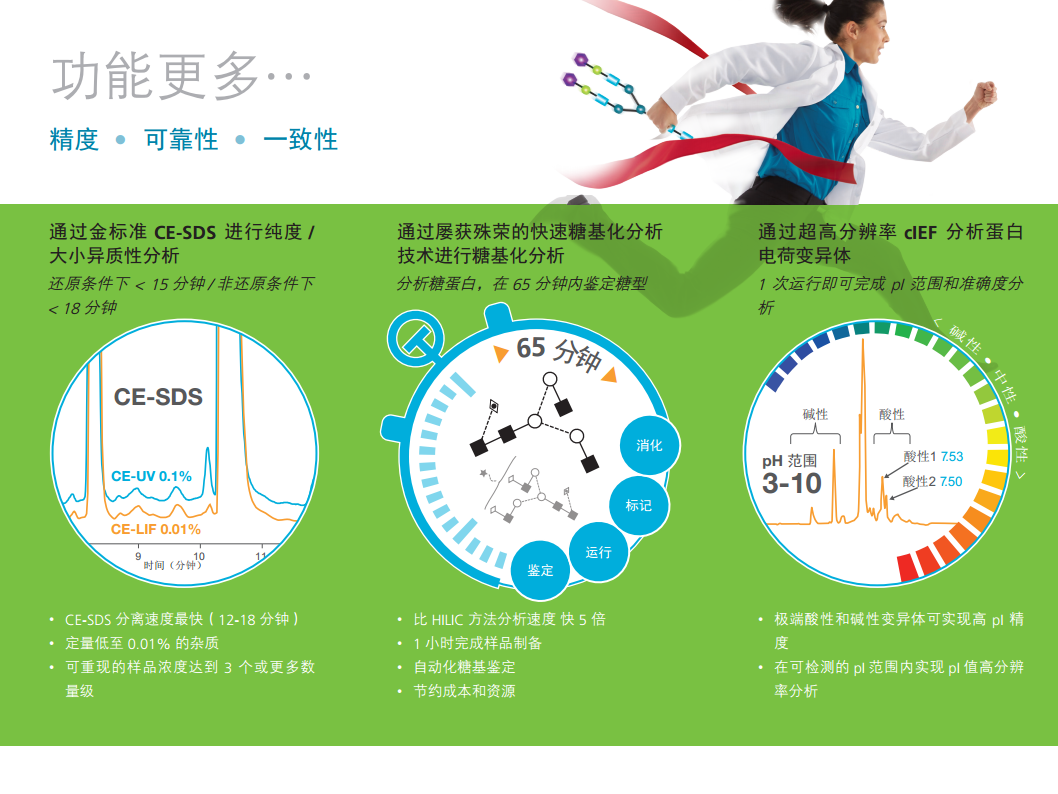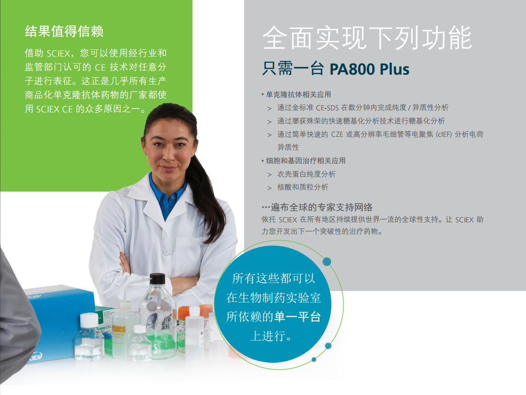 PA800 Plus生物制药分析系统具有强大的分析功能及易于使用的特性,可对蛋白纯度、电荷异构体的分布和糖类进行自动化定量及定性分析。目前,已有上百家全球生物制药企业使用PA800 Plus,该系统为他们提供了对蛋白特性分析的自动化定量综合解决方案。