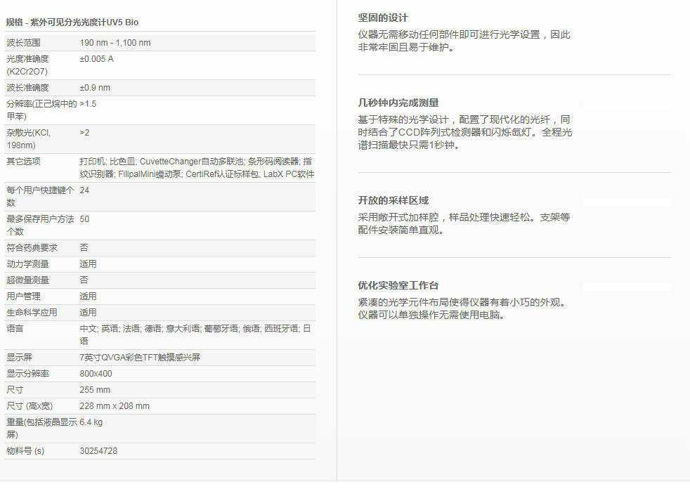 用于生命科学的比色皿紫外可见分光光度计。用于Bradford测定法、Lowry测定法、BCA蛋白测定法和双缩脲蛋白测定法,以及用于OD600、DNA、RNA和蛋白分析(例如A260、A260/A280)等的预定义方法。用于温控动力研究的配件可用。