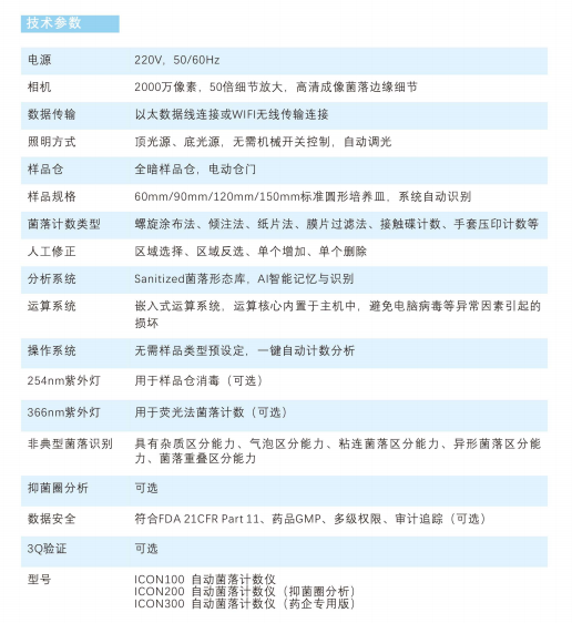 ICON⾃动菌落计数仪,由图像采集系统和菌落统计分析软件构成,具有菌落统计、细胞统计*、抑菌圈分析*、噬菌斑筛选*、典型菌筛选、菌株特征检测与描述等功能,适⽤于⽣物医药、检验检疫、疾病控制、质量监督、环境监测、⻝品卫⽣,以及⼤专院校、研究院所等领域中的微⽣物菌落分析和科学研究。